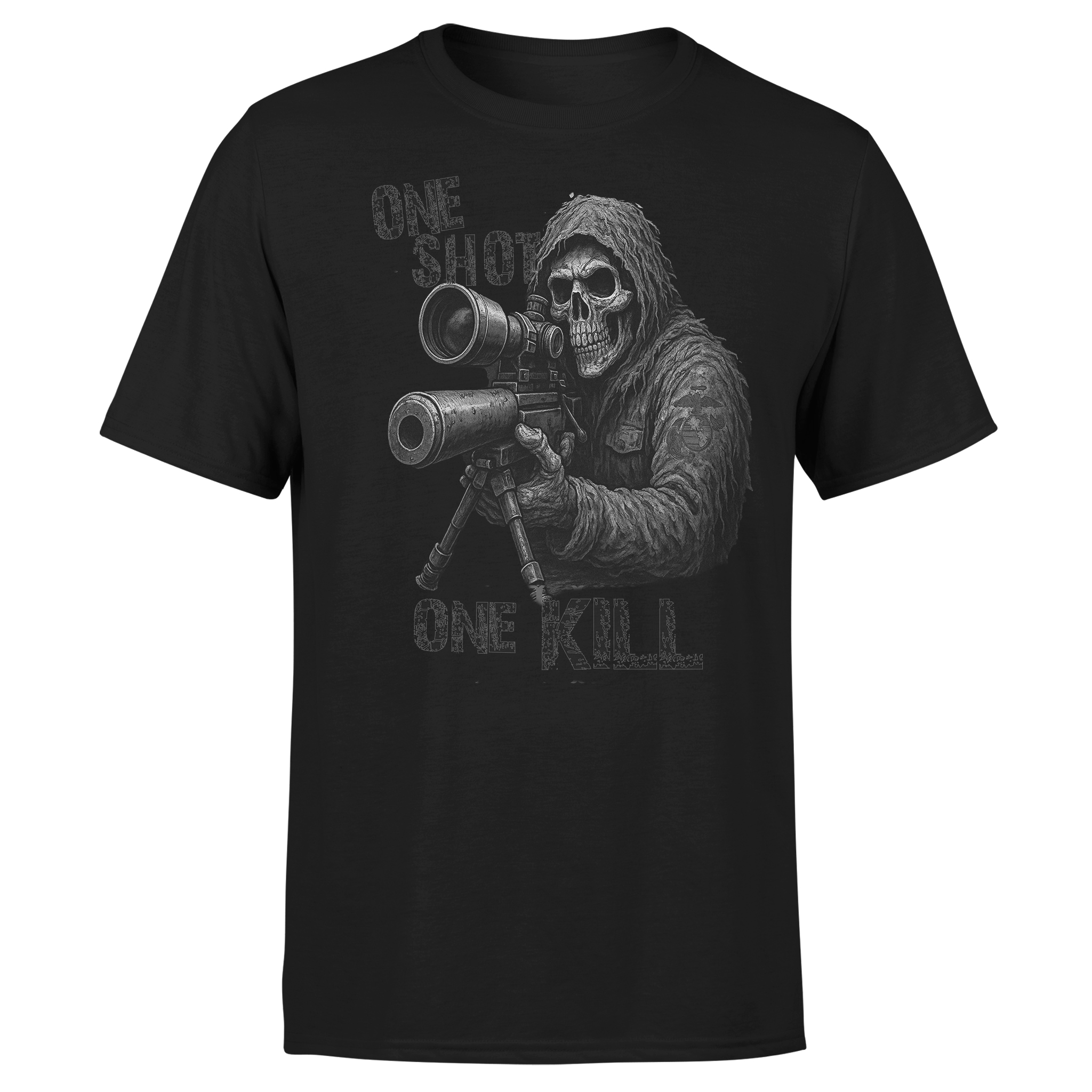 Designed for warriors of mind, mission, and mindset, the One Shot One Kill T-Shirt hits hard. Featuring a grim reaper-style sniper graphic with military-grade detail, this shirt is for those who know what it means to stay focused and strike true.